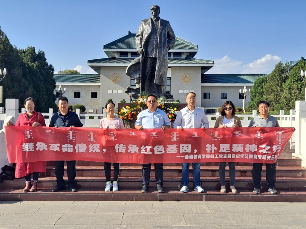 为庆祝中国共产党成立100周年,中华人民共和国成立72周年,传承弘扬革命先辈的崇高精神,增强学习党史实效,追寻共产党人的初心和使命,9月29日下午,基础教育学院党总支组织全体教职工赴乌兰夫同志纪念馆开展了“继承革命传统,传承红色基因,补足精神之钙”党史学习教育主题党日活动。