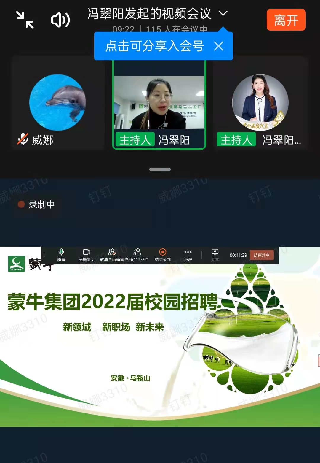 为进一步做好2022届毕业生就业工作,为更多的毕业生提供就业平台,加深大学生对行业的认知,传递企业知识,培养学生技能,学校于12月2日晚6点,在钉钉会议平台举办蒙牛集团企业宣讲会。蒙古学学院、经济管理学院、公共管理学院2022届毕业生150余人参加了本次线上宣讲会。