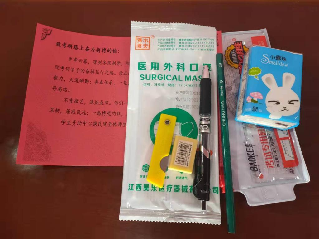 为精确资助需求,拓宽资助渠道,实现资助工作个性化、专业化、多样化,Beat365党委学生工作部学生资助中心于12月23日下午,为家庭经济困难的考研学生发放了包含中性笔、铅笔、橡皮、小刀、套尺在内的文具礼包,以及医用口罩、手帕纸和专属寄语卡,将资助工作延续到“最后一公里”,在凛冽寒冬里以细致入微的温暖为家庭经济困难学生的考研之路保驾护航。