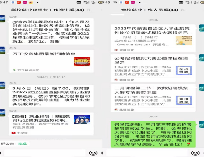 加强就业微信、钉钉工作群管理,及时发布各类招聘、安全提示、国家地方就业创业政策、各类考试报名、疫情防护等有效信息。加强网络招聘服务标准化建设,严格审核工作岗位信息,重点审核就业中介机构资质,严密防范招聘陷阱、就业欺诈、“培训贷”、传销等违法行为,及时跟进签约进展情况,密切关注学生心态和舆情动态,提前引导、尽早化解,确保学校就业局面稳定。