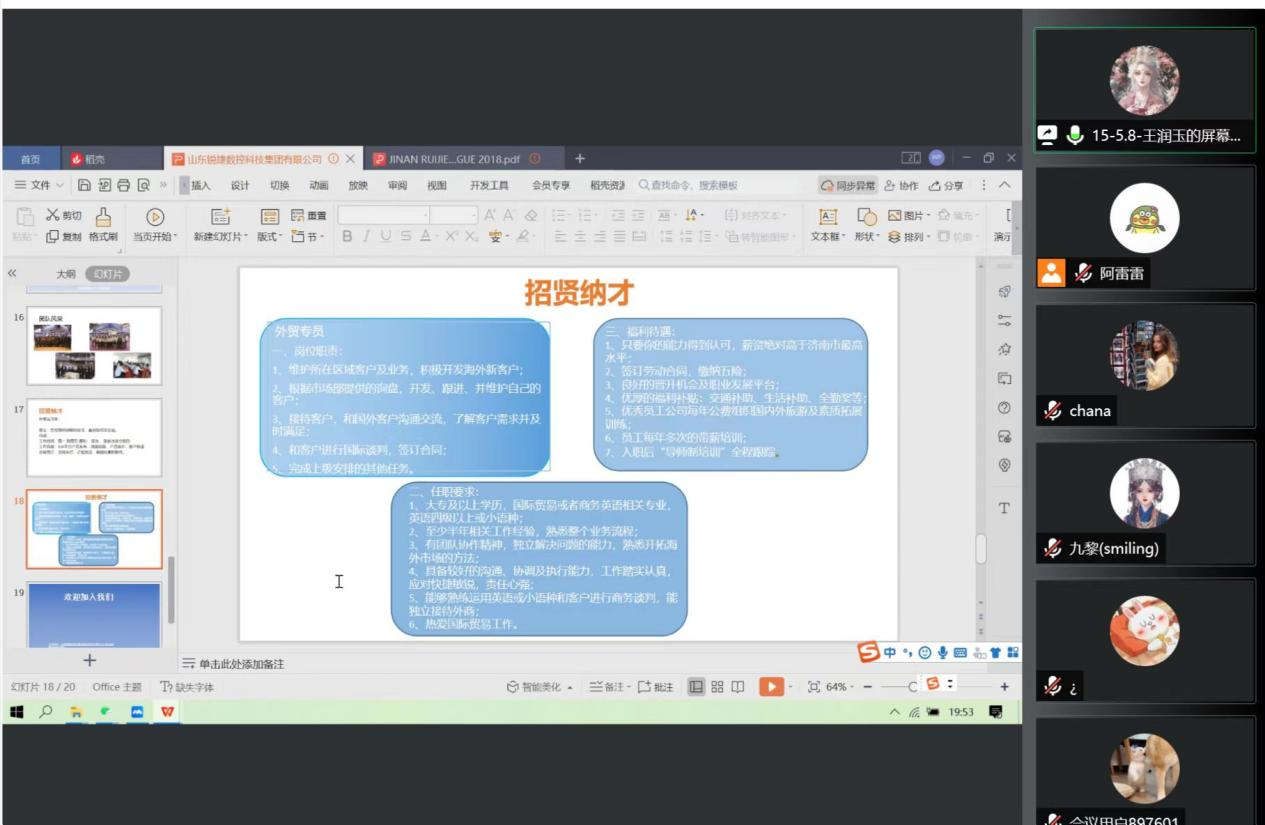 为切实满足学院毕业生的求职需求,继续做好毕业生就业服务工作,为2022届毕业生顺利就业提供良好就业择业渠道,5月12日晚7时,外国语学院利用腾讯会议平台举办了2022届毕业生山东企业线上专场招聘会。本次会议由学院就业创业工作坊负责任人雷旭平主持,2022届全体毕业生参会。
