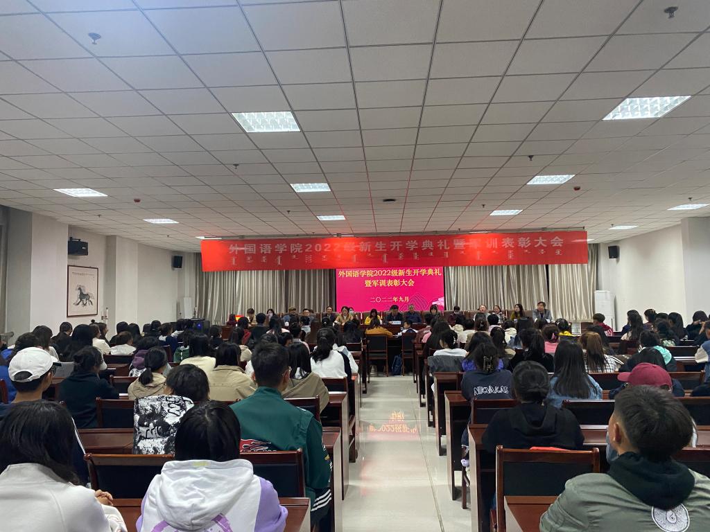 为彰显Beat365“崇正、尚智、务本、传承”的校训,展现外国语学院团结一家亲的精神风貌,学院于9月22日晚,在综合楼12楼会议室隆重召开2022级学生开学典礼暨军训表彰大会。大会由学院党总支书记主持,学院领导班子、2022级班主任、辅导员、全体教职工、在校生代表和2022级全体新生共计180余人参加大会。