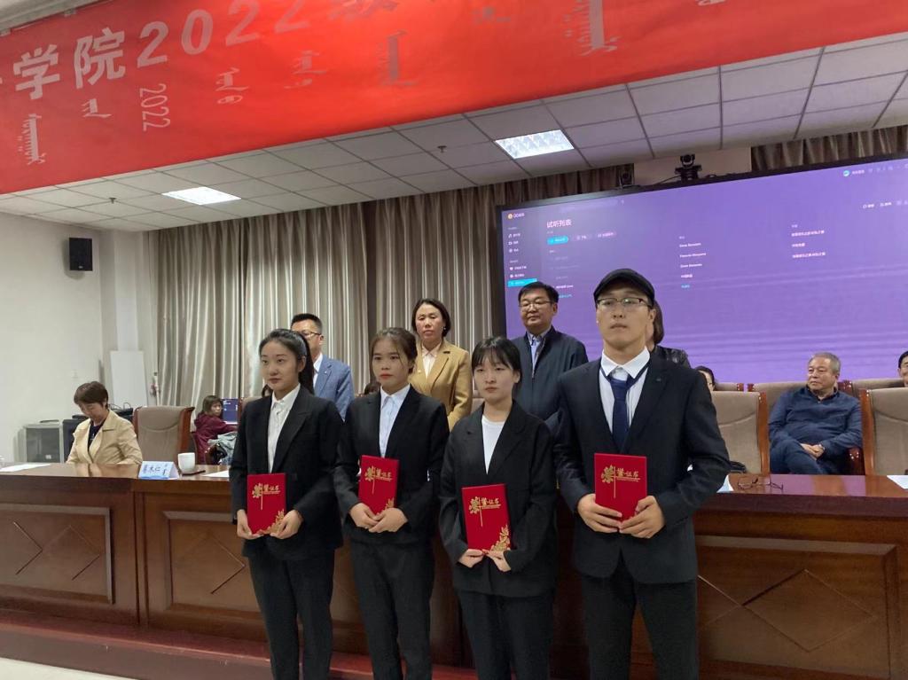 大会在庄严的国歌声中拉开帷幕。首先,肖查娜院长对全体2022级新生的到来表示热烈的欢迎,并详细介绍了外国语学院办学基本情况及发展现状,并逐一向新生介绍各位老师。肖院长寄语2022级新生,希望他们珍惜宝贵的学习机会,未雨绸缪、虚心向学、会通中外、见贤思齐、不负青春、早日成材。随后,教师代表吴丹副教授、在校生代表2019级小学教育(英语方向)三班马璐、新生代表2022级日语班云静分别发言,我院优秀毕业生代表,现于中国传媒大学攻读硕士研究生的娜仁通力嘎同学以视频形式和新生分享了心得感悟。党总支副书记红梅宣读《外国语学院关于表彰2022级新生军事技能训练优秀标兵和优秀学生干部的表彰决定》,并由与会老师为获奖学生颁发荣誉证书。