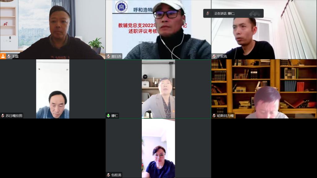 教辅党总支五个党支部在撰写述职报告的基础上,召开教辅党总支扩大会议形式线上进行党支部书记现场述职评议。在评议中,教辅党总支书记那日苏同志全面衡量被评议的党支部书记,作出公正、客观、实事求是的评价,坦率、诚恳地对被评议的党支部书记工作成绩和进步给予肯定,对存在的问题和不足提出建议,指出努力的方向。