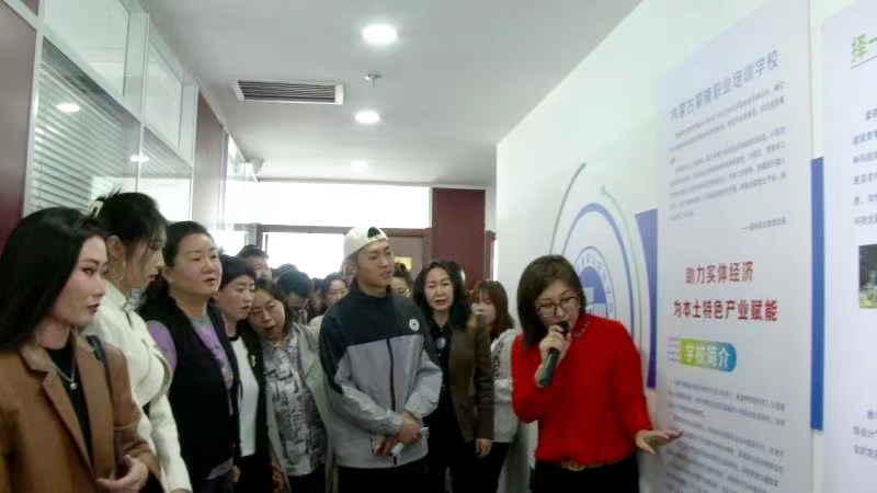 在签约会上,蒙隆职业培训学校白银花校长就如何为我院民族服装设计、民族手工艺制作专业学生提供职业资格专业培训,充分利用其"产、学、研、销"平台优势,与我院形成资源互补,实现产业联动,从而带动我院学生就业创业方面做了介绍。塔娜副院长和白银花校长签订实践教学基地和就业合作协议,并举行了挂牌仪式。随后师生共同参观了蒙隆职业培训学校。