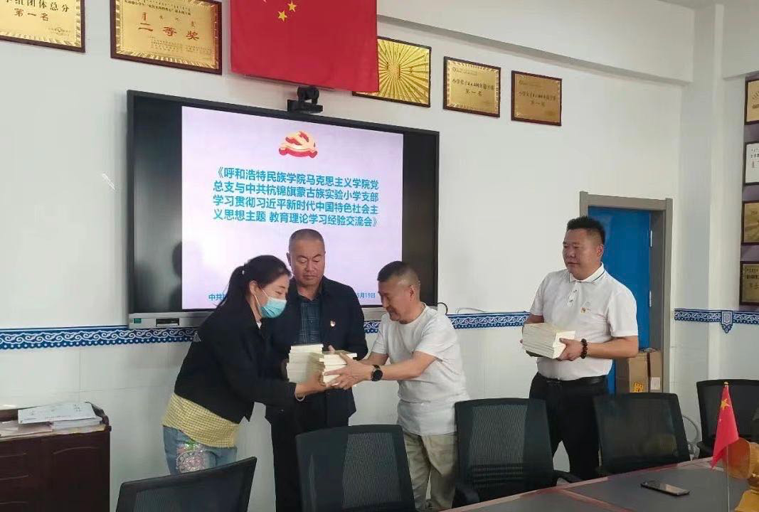 紧接着,师生党员深入开展学习贯彻习近平新时代中国特色社会主义思想主题教育。苏雅拉代表马克思主义学院向杭锦旗蒙古族实验小学赠送习近平新时代中国特色社会主义思想学习资料。参会党员结合理论学习和自身工作进行发言。