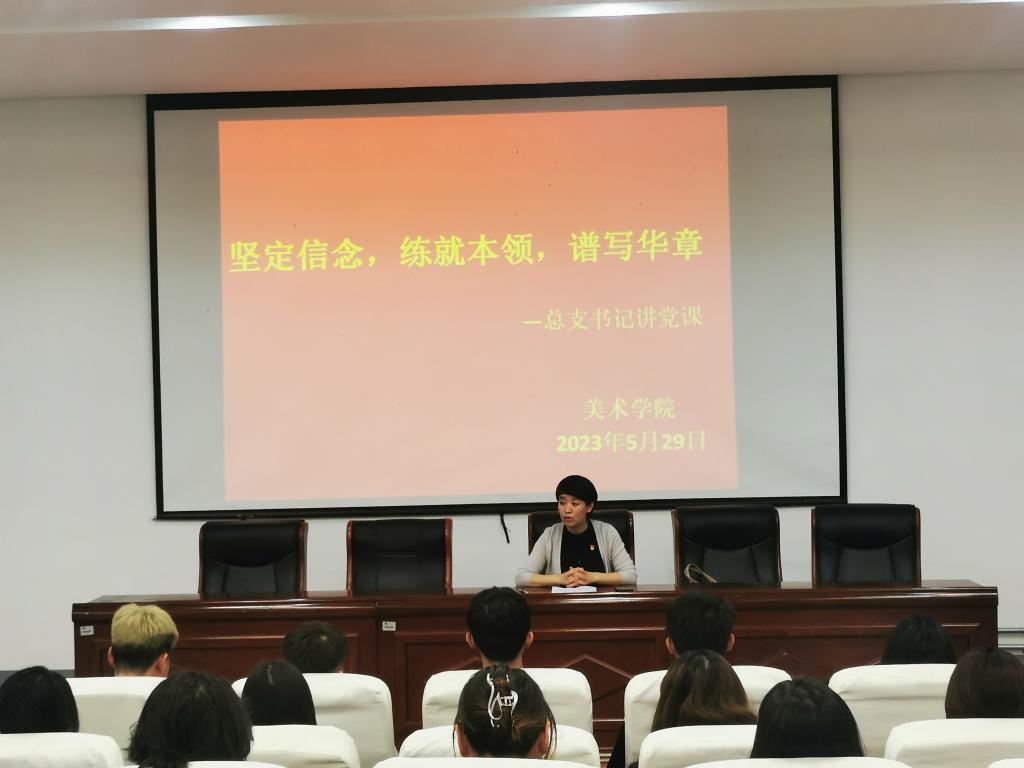 为进一步推深做实理论学习,提高素养,提升觉悟,结合学校党校2023年上半年培训任务安排,5月29日晚,美术学院党总支书记吴利春以“坚定信念,练就本领,谱写华章”为题,向美术学院全体入党积极分子、发展对象、部分学生党员讲授了专题党课。