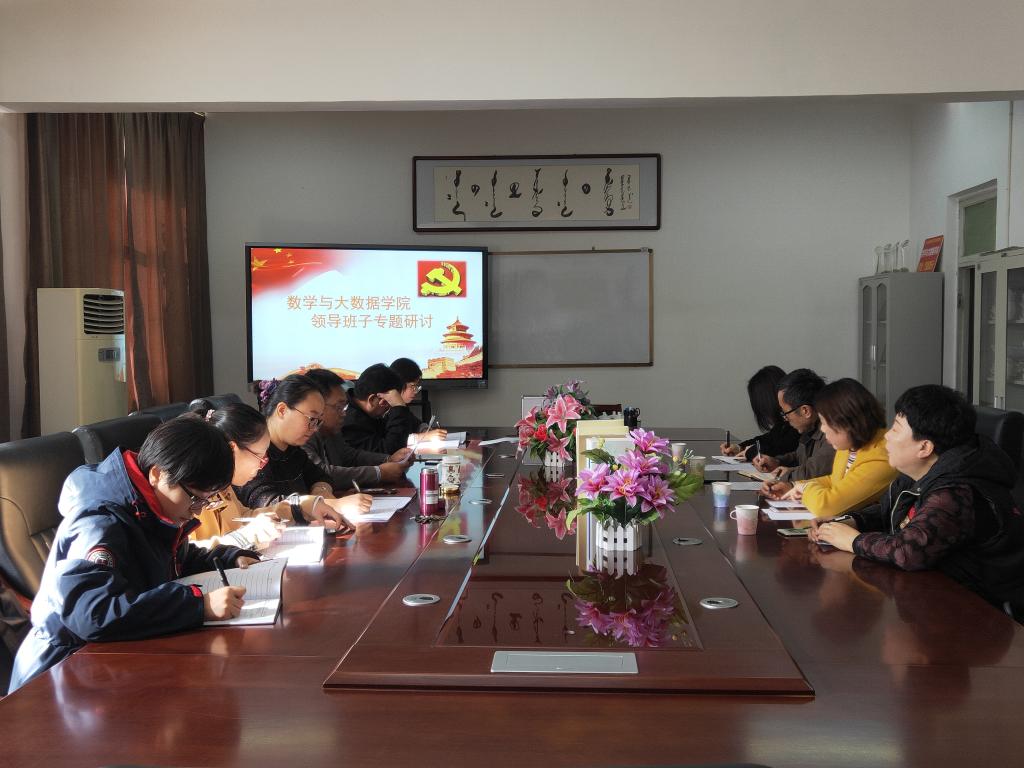10月24日上午,数学与大数据学院在沃德楼205会议室(主题教育读书室)召开班子成员对照党章党规找差距专题会议,学校主题教育第三指导组海泉组长一行到会指导。学院领导班子成员在前期逐条认真学习的基础上,对照党章、《关于新形势下党内政治生活的若干准则》《中国共产党纪律处分条例》查摆问题,并结合个人、职责、工作实际谈学习认识、谈短板不足、谈问题原因、谈整改举措。