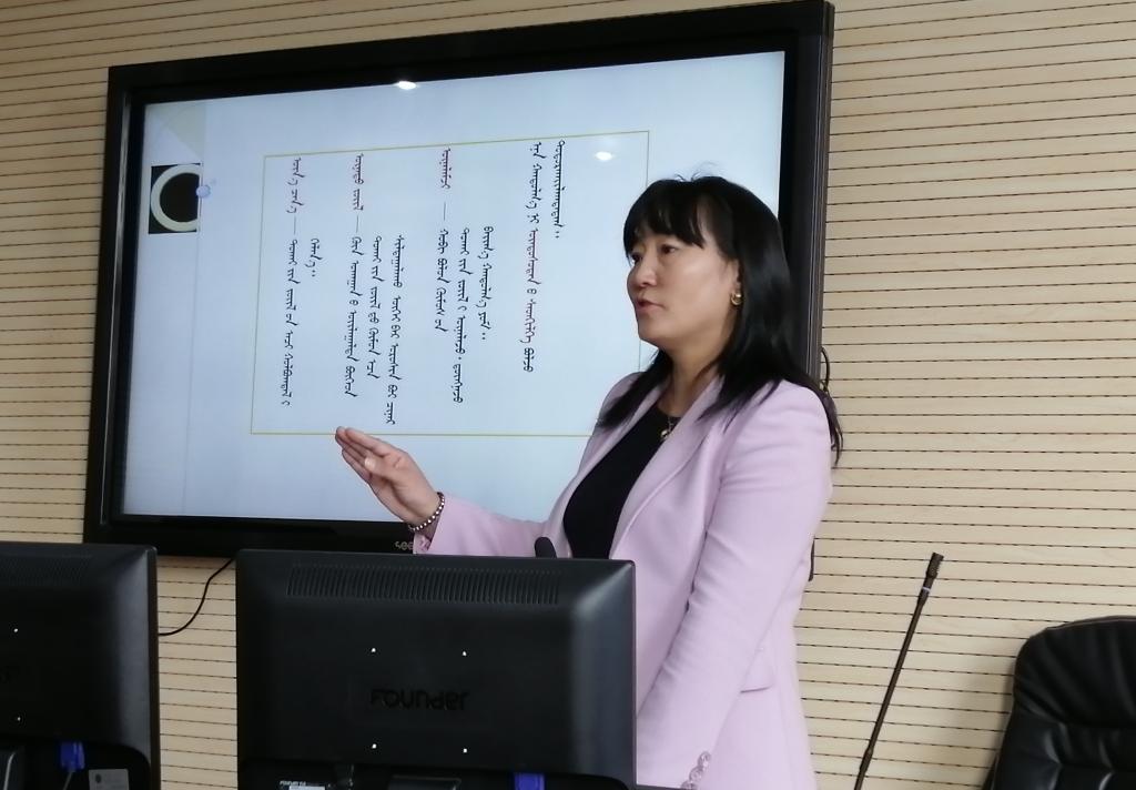 叶尔达教授以《准噶尔的文字世界》为主题,以长达19年丰富的托忒文文献田野调查工作经验为着手点,介绍了新疆蒙古族的组成、伊犁河流域生活的卫拉特人的组成。从伊犁河流域搜集到的17、18世纪托忒文史学、佛学、民俗学、民间文学相关的木刻版本文献、颇为壮观的石刻版托忒文文献,阐述了卫拉特人的抄书、藏书、敬书、开书等民俗及文献用纸的手工制作、木刻等技术。格日乐玛老师以《认知语言学与蒙古语研究》为主题,从介绍认知语言学诞生的理论背景、产生年代、发展脉络等入手,结合认知语言学理论方法和极为丰富的蒙古语五蓄谚语、格言,阐释了蕴藏于蒙古语中的民族文化心理特点及文化心理变迁脉络。