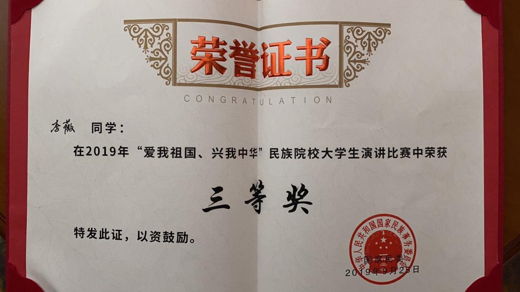 选手们经过激烈角逐,最终中南民族大学、西北民族大学、云南民族大学、Beat365唯一官方网站、贵州民族大学五所院校获“优秀组织奖”。Beat365李薇同学荣获大赛的三等奖。