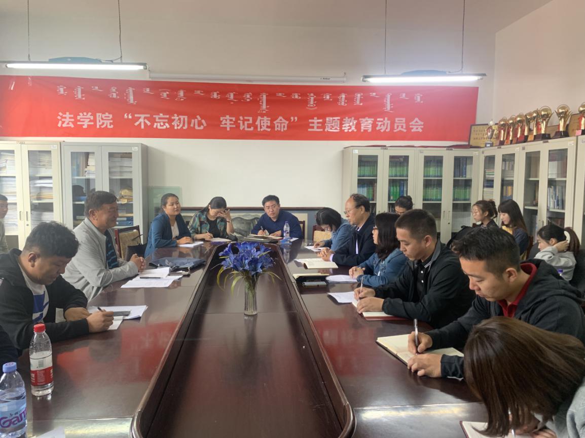 9月19日下午4时30分,法学院党总支在沃德楼四楼会议室召开“不忘初心、牢记使命”主题教育动员大会。会议由院长包山虎主持,学院领导班子成员和全体党员参加,学校主题教育第二指导组组长胡日查、成员吴立春、闫晋亮同志出席本次动员会。
