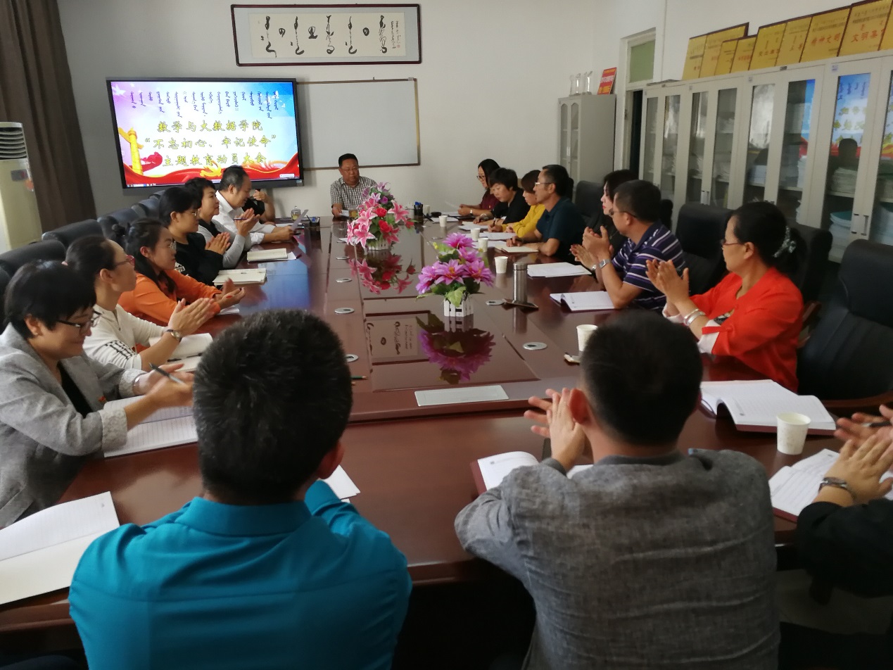 为深入学习贯彻习近平新时代中国特色社会主义思想和习近平总书记关于“不忘初心、牢记使命”主题教育一系列重要指示批示精神,深入落实中央、自治区党委和校党委“不忘初心、牢记使命”主题教育部署会议精神,9月18日下午在沃德楼205会议室召开数学与大数据学院“不忘初心、牢记使命”主题教育动员大会。学校“不忘初心、牢记使命”主题教育第三指导组组长海泉处长一行四人到会指导。党总支书记布和朝鲁教授作动员部署讲话,学院党政班子成员、全体师生党员参加了会议。会议由党总支副书记郝喜凤主持。