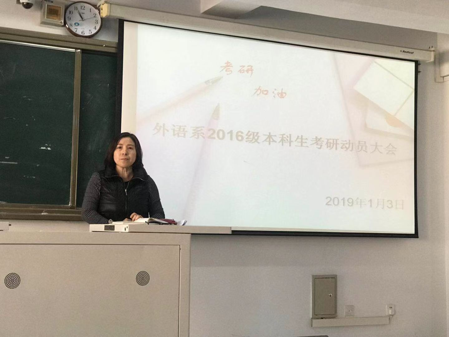 1月4日上午10时20分,外语系在都林楼518教室召开2016级本科生考研动员大会。外语系主任肖查娜、党总支书记布和朝鲁、党总支副书记红梅、考研班班主任高乌兰、2016级各班班主任及2016级全体学生参加了本次大会,会议由高乌兰老师主持。