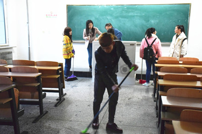 汉语言文学系同学打扫教室