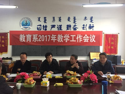12月28日上午9时,教育系在系资料室召开了2017年教学工作会议。会议由教育系党总支书记王福清主持,学校教务处副处长胡毕斯哈拉图、督导组组长金锁、教育系系主任刘根岁、教师和学生代表参加会议。