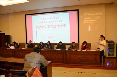 毕业生撰写毕业论文是大学本科人才培养的一个重要环节,也是检验学生综合素质与实践创新能力的有效途径。为进一步做好2018届本科生毕业论文工作,提高本科生毕业论文质量,11月16日上午10时,外语系在图书馆一楼报告厅召开了2018届日语专业及小学教育(英语方向)专业毕业论文工作启动大会。启动大会由英语教研室主任红霞主持,外语系日语教研室、英语教研室毕业论文指导教师及2018届日语专业、小学教育(英语方向)专业全体毕业生参加了本次会议。
