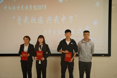 为迎接党的十九大胜利召开, 9月11日晚, 校团委在图书馆一楼报告厅举办了“爱我祖国 兴我中华”大学生演讲比赛,团委文体部负责人郭晨、体育系团总支书记孙玉波、汉语言文学系团总支副书记张子涵、马列教研部团总支副书记乌丽娅素担任了比赛的评委。