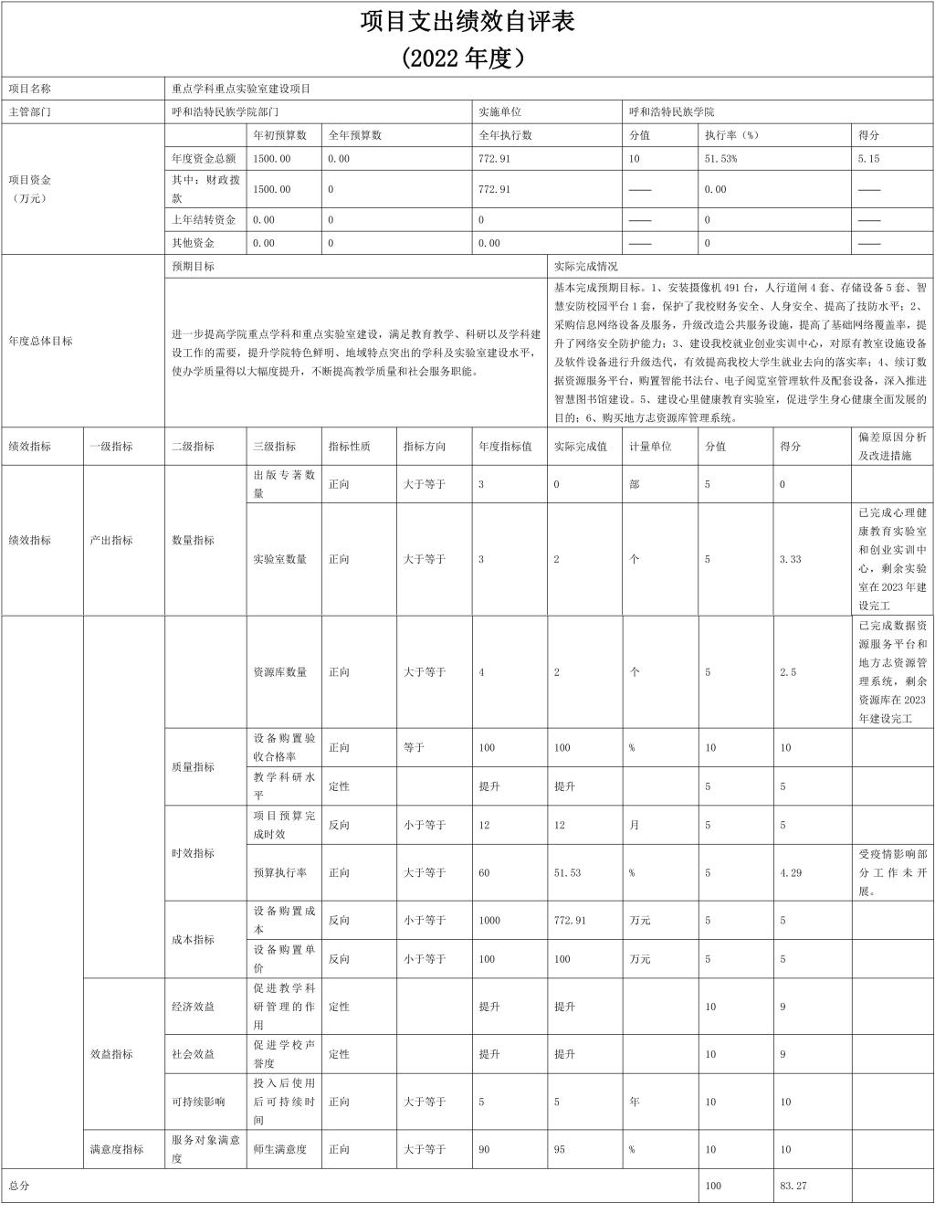 根据年初设定的绩效目标,项目自评得分83.27分,评价结果为良好。全年预算数为1500万元,实际预算执行772.91万元,预算执行率为51.53%。项目绩效目标完成情况:新增2个实验实训室,建设2个资源库,设备购置验收合格率100%,师生满意度95%,有效促进教学科研的专业水平和管理能力提升,网络安全性得到有效提升,满足未来5年的教学科研需求等。发现的问题:各学科稳步发展,但是特色学科优势不足,需要进一步加强学科建设,积极参与学科建设会议及学术研讨,提升教学科研能力。