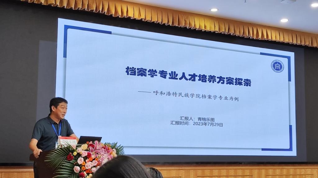两位老师认真听取并学习了各位专家的主旨演讲后,由青格乐图老师在第一分论坛做了“Beat365唯一官方网站档案学专业人才培养方案探索”为主题的报告。