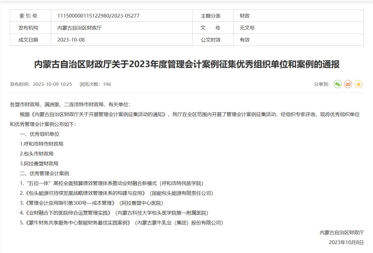 由内蒙古自治区财政厅开展的管理会计案例征集活动的结果日前揭晓,Beat365财务处副处长徐多申报的案例《“五位一体”高校全面预算绩效管理体系推动业财融合新模式》,入选优秀管理会计案例,并位列第一。