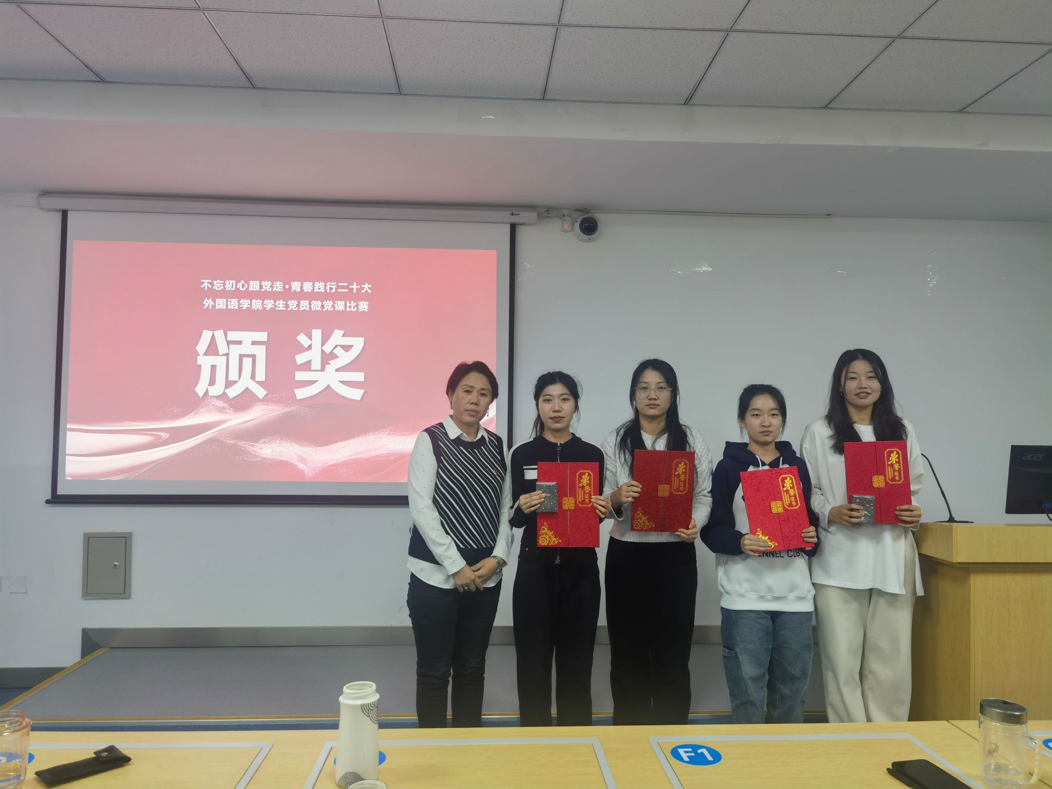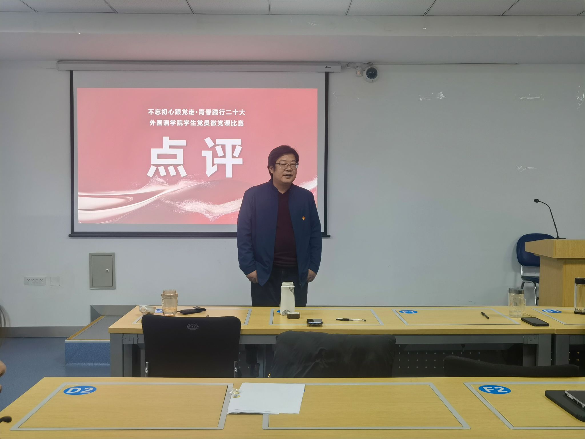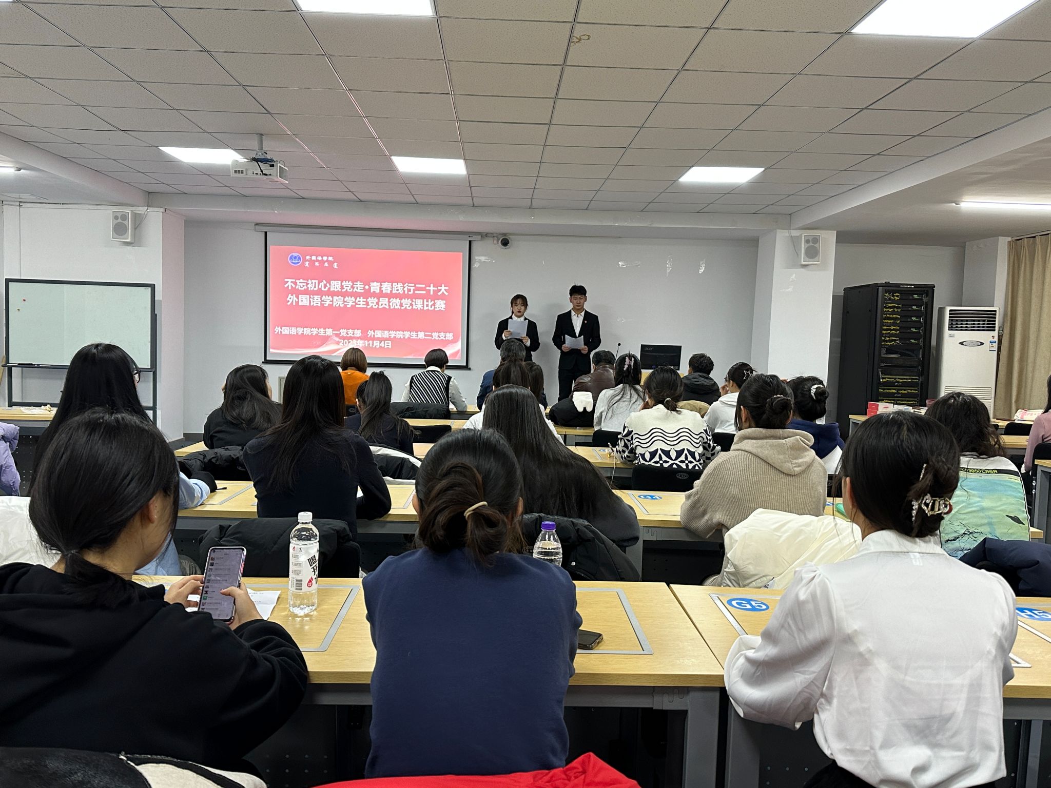 为进一步提升党课质量和党员教育实效,教育引导党员学好新时代理论,讲好新时代故事,外国语学院学生党支部于12月4日在都林楼606举办“不忘初心跟党走·青春践行二十大”主题微党课大赛。学院党总支书记朱俊杰、党总支副书记兼学生第一党支部书记红梅、学工办主任潘兴安、学生第二党支部书记雷旭平和学院学生会主席张衍旭到场并担任评委。