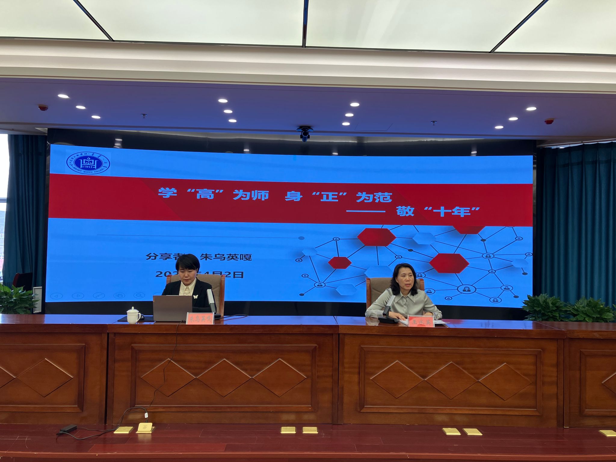 朱乌英嘎结合个人从学、从教、科研的切身经历诠释了讲座主题——“学高为师·身正为范”,朱老师的讲座处处体现了对教师工作始终不渝的热爱和对教育事业的执着追求,其崇高的师德风范,鼓舞并激励着在场的每一位新入职的教职工。