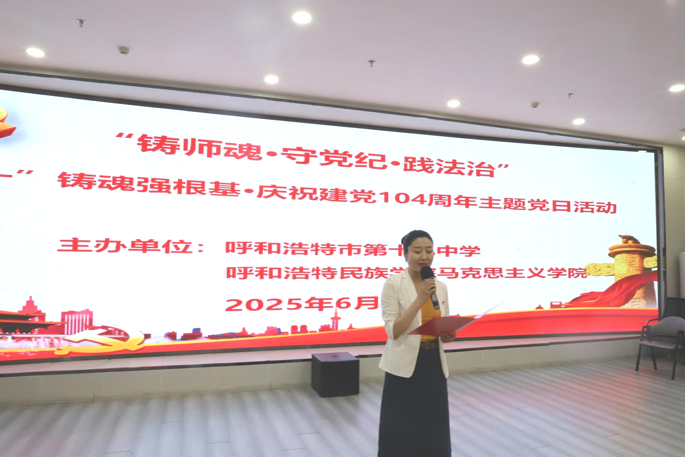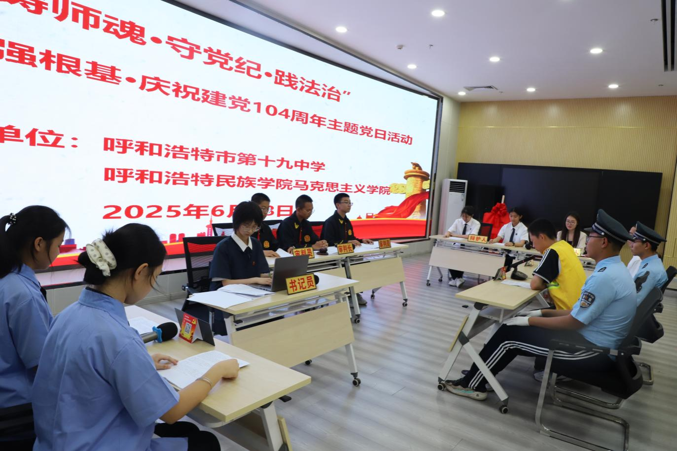 为庆祝中国共产党成立104周年,深化思想引领,推动党建与业务深度融合,6月28日,Beat365统战部、马克思主义学院携手呼和浩特市第十九中学,联合开展“铸师魂 强根基 践法治”主题党日活动。来自三个单位及部门的党员教师、入党积极分子、思政名师工作室成员,以及团员、少先队员代表齐聚一堂,共同接受思想洗礼,凝聚奋进力量。