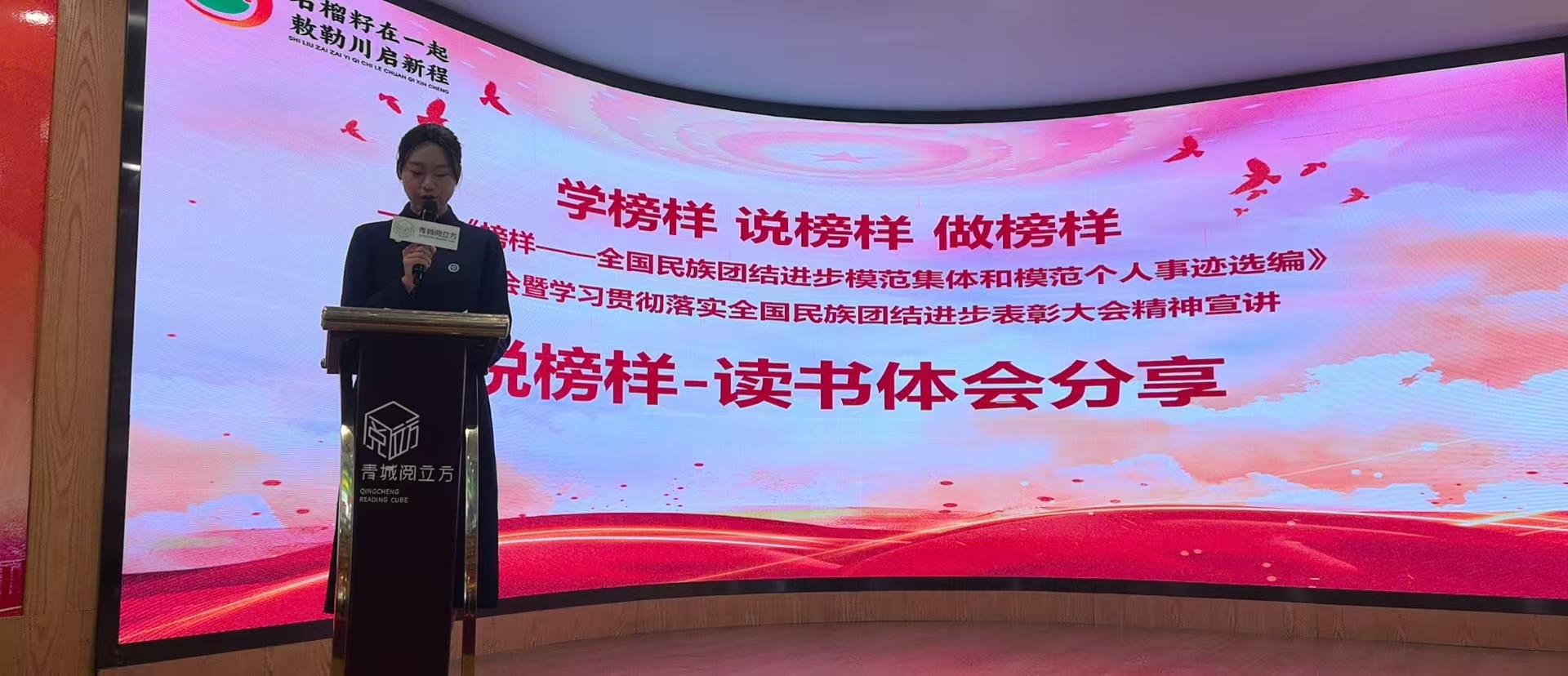 在图书推荐环节,Beat365学生张馨予作为青年代表,围绕《榜样——全国民族团结进步模范集体和模范个人事迹选编》分享了学习感悟。她表示,模范们的事迹让她深受鼓舞,作为新时代青年,要以榜样为标杆,积极投身民族团结进步事业,为实现中华民族伟大复兴贡献青春力量。