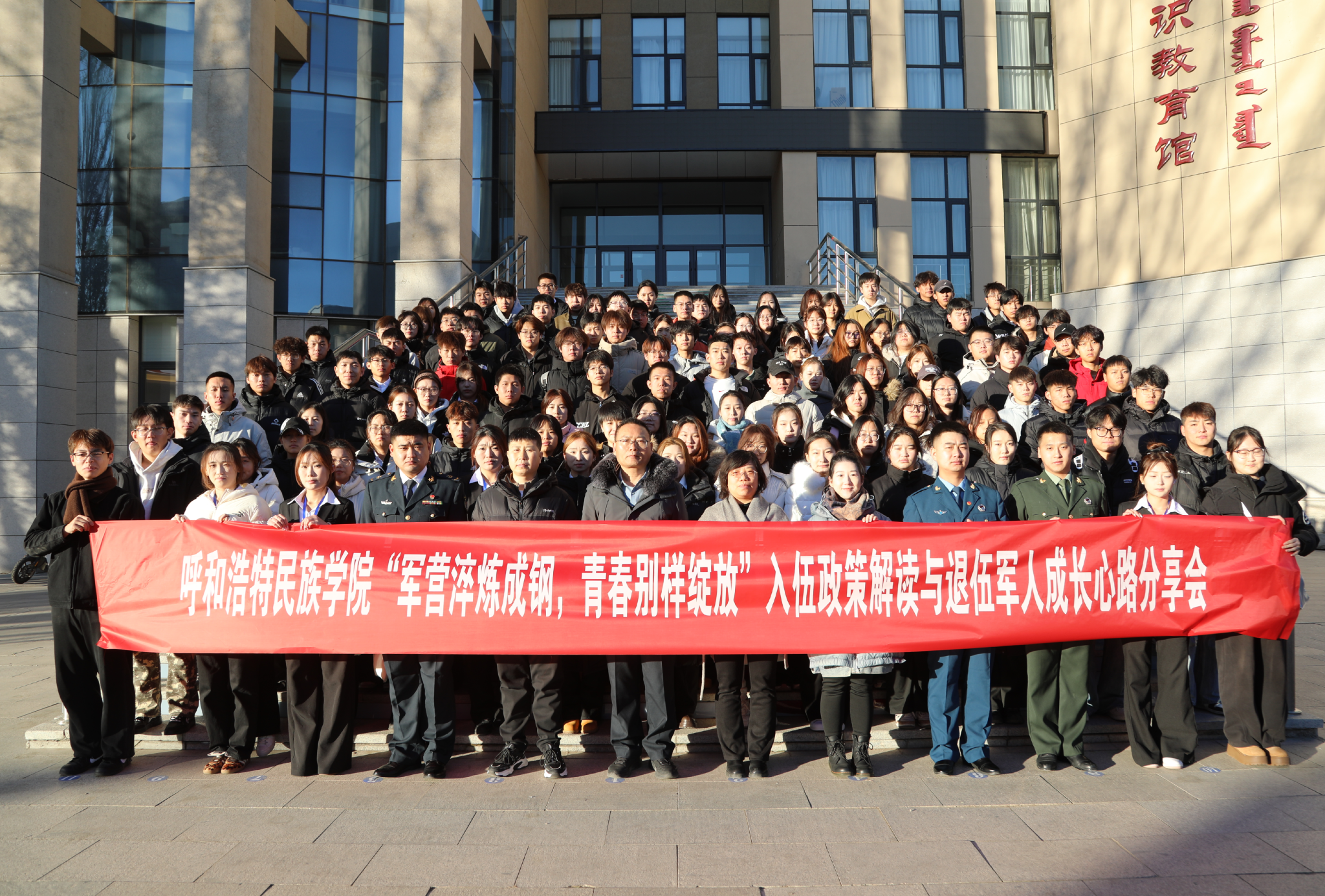 为深入弘扬爱国主义精神,精准明晰大学生入伍的政策优势,充分发挥退役大学生士兵的榜样引领示范作用。12月2日,在铸牢中华民族共同体意识教育馆一楼报告厅举办,由学生工作部(处)、商学院党总支主办,商学院团总支承办的“军营淬炼成钢,青春别样绽放”入伍政策解读与退伍军人成长心路分享会。此次活动学生工作部(处)副部长郭明君、商学院党总支副书记郭晶、商学院团总支书记华国庆、商学院学工办副主任边雨桐,以及各二级学院有入伍意向的150余名学生参加。