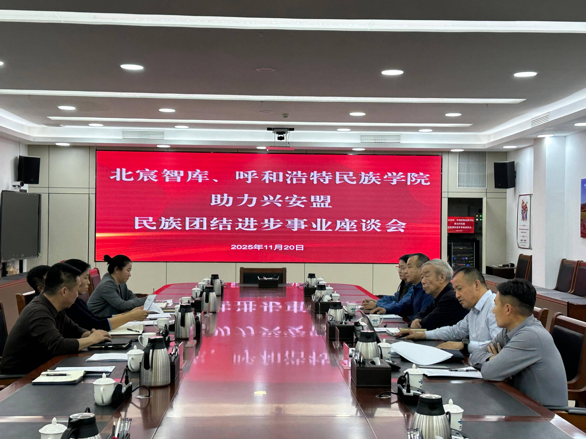 11月20日,调研组与兴安盟党委统战部部长曹善淑、副部长王连鹏及民委相关部门负责人座谈,围绕兴安盟“两区一窗口”创建成效、铸牢中华民族共同体意识的基层实践、校地合作推动理论转化等议题进行深入交流。