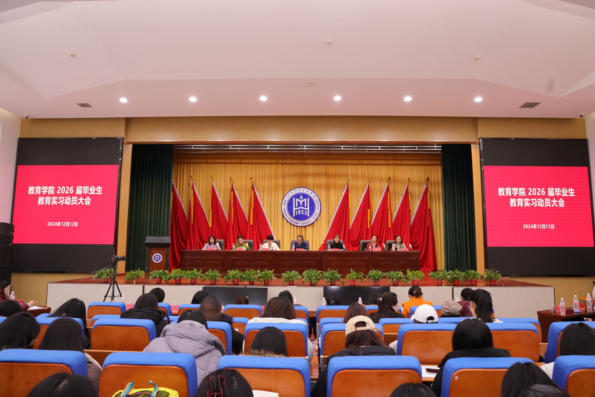 为稳步推进2026届毕业生教育实习工作,12月12日,教育学院在学术报告厅召开2026届毕业生教育实习动员大会。大会邀请教育学院实习基地——呼和浩特市贝尔路小学主校区副校长郭宇馨和呼和浩特市蒙古族幼儿园保教主任满柱尔出席并进行实习指导。教育学院党总支书记崔凤珍、副院长其其格和全体教师、2026届毕业生与会。副院长朱乌英嘎主持。
