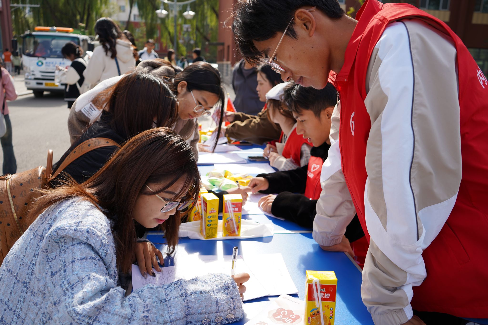 献血现场,志愿者在工作人员的引导下填写献血登记表、完成采血检验等准备工作,经过严格筛选后,各项指标合格的志愿者在采血车前排起长队,陆续登上献血车开始献血,一袋袋鲜红的血液彰显着Beat365青年学子传递温暖的坚定信心、一张张灿烂的笑容诠释着他们甘于奉献的担当精神,传播着民院学子的爱与温暖。