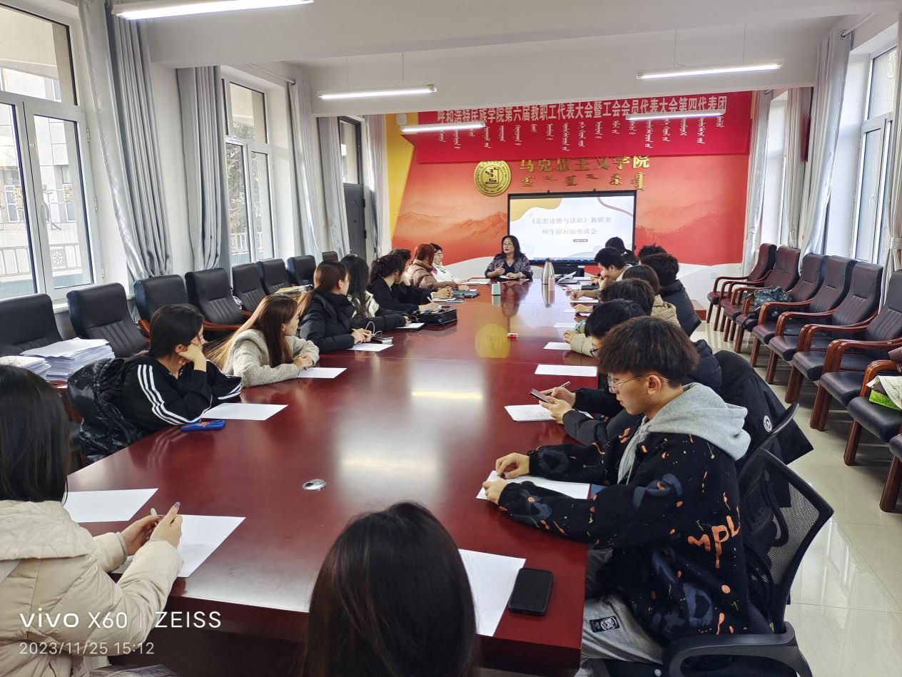 11月25日, 教研室在崇正楼217会议室,邀请了任课教师以及来自学校各专业的学生代表,共同交流、探讨《思想道德与法治》课程课堂教学问题。首先,教研室主任乌兰格日勒老师从学科、就业、人生三个角度向学生强调了《思想道德与法治》的课程意义,并介绍了本学期的教学安排。随后,师生展开了具体交流,每位学生代表就教学情况与学习感受,充分传达了所在班集体的意见与建议,主要包括:提高教学形式的灵活多样性,例如贴近学生生活讲故事、组织情景剧、辩论赛等;强化课程的结构性,突出课程思路,强调重点内容;细化实践课的指导与部署,提供具体范例、明确小组分工;引入竞争机制或奖励机制,驱动学生思考与表达等等。针对学生的一些意见,任课教师做出了相应反馈,解释了教学任务与授课时量的现实矛盾,另一方面也讲解了大学与高中学习方式的不同,引导学生从被动式学习转变为主动式学习。最后,学生代表们以匿名形式现场提交了书面意见。