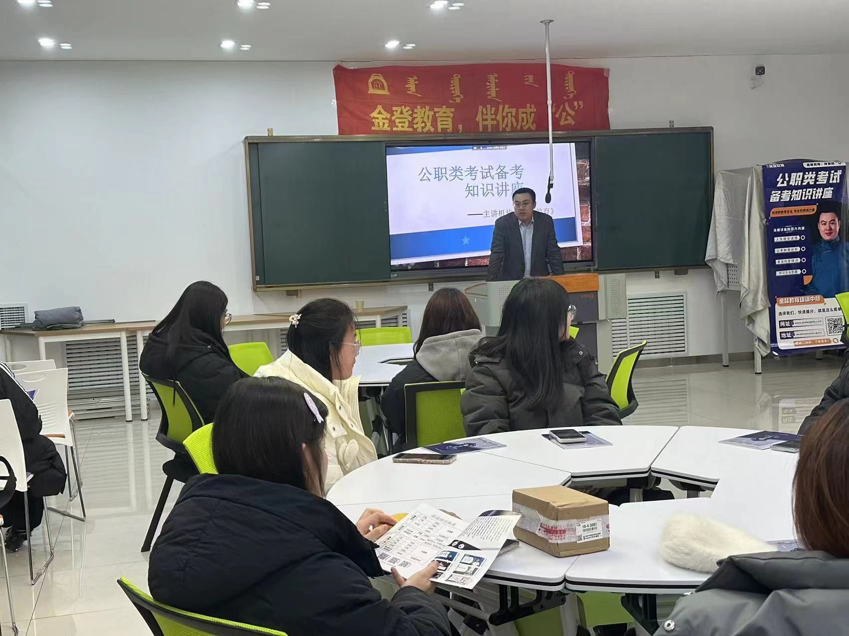 11月28日,邀请相关培训机构举办考公知识讲座。机构老师讲解国家、自治区目前公务员的现状、形势的有关内容以及备考方法和技巧,同时根据历年的数据对岗位的报考进行解读和分析,帮助考生选岗位报岗精准、高效,提高进面机会,增加就业可能。