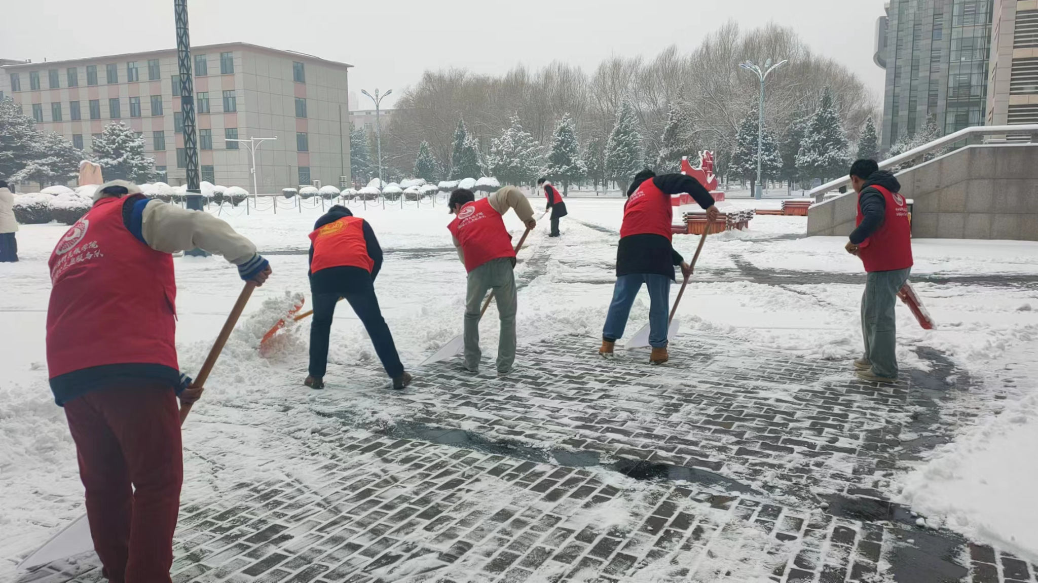落白寒人,除雪暖心。在老师的带领下,志愿者们手持扫帚与雪铲等工具,全身心投入到扫雪除冰工作中。他们克服寒风、低温,高效配合,团结一致,以极大的热情与动力将厚厚的积雪清理到道路两侧,成功扫除了尚智楼门前及周围的积雪,为大家清理出宽敞干净的通行之路。