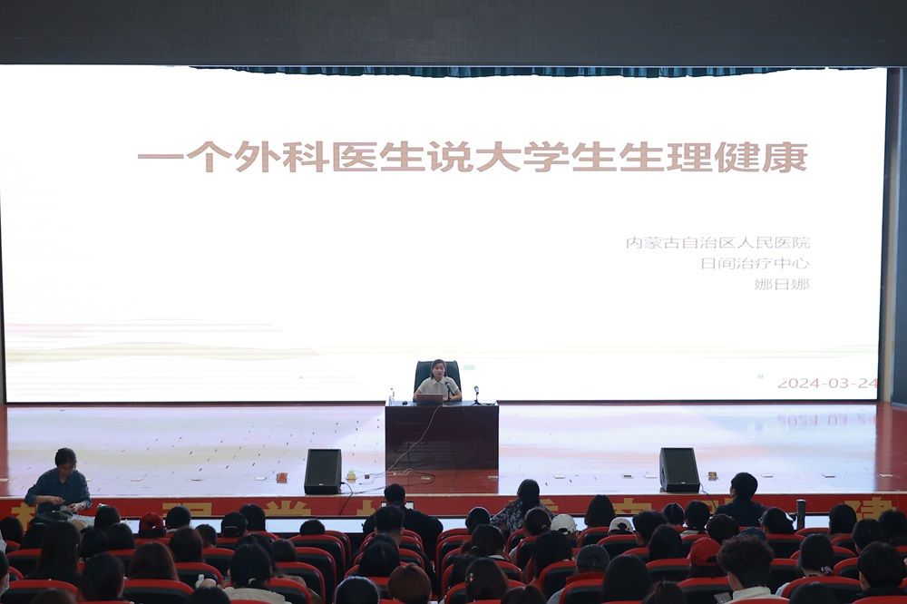 为贯彻落实《“健康中国2030”规划纲要》《“十四五”国民健康规划》精神,加强大学生生命安全教育,提升大学生的健康素养,3月24日,学校特邀内蒙古自治区人民医院主任医师娜日娜,副主任医师、护士长李雅卿来校开展“呵护健康 珍爱生命”——生理健康守护青春专题讲座。本次活动由教务处主办,化学与环境学院承办,教务处、化学与环境学院教师和全校师范类专业学生700余人收听了讲座。