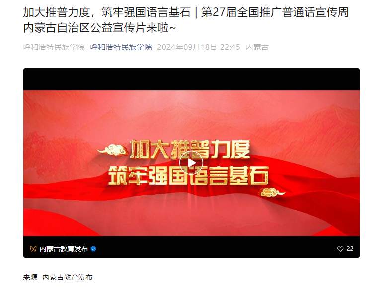 学校官方公众号分别发布《加大推普力度,筑牢强国语言基石 | 第27届全国推广普通话宣传周内蒙古自治区公益宣传片来啦》《加大推普力度 筑牢强国语言基石——第27届全国推广普通话宣传周海报来啦》《加大推普力度,筑牢强国语言基石 | 第27届全国推广普通话宣传周》《第27届全国推广普通话宣传周重点活动在新疆喀什举办》等推文在师生中进行广泛宣传。教学楼、宿舍楼等11块思政教育电子屏上投放第27届推普周宣传海报进行滚动宣传播放。各学院也结合专业特色印制海报、悬挂条幅,共同营造了浓厚的推普学习活动氛围。