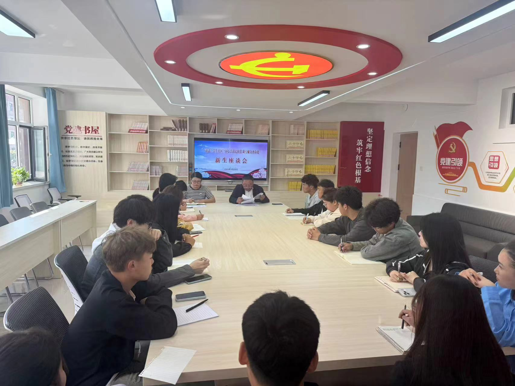为深入学习贯彻党的二十届三中全会精神,庆祝中华人民共和国成立75周年落实习近平总书记关于加强和改进民族工作的重要思想,进一步教育引导全校师生铸牢中华民族共同体意识,持续深化民族团结进步创建工作,9月26日下午,学生工作部组织各学院学生代表在“一站式”学生社区“一学院一品牌”主题文化公寓党团活动室召开了“同心共话民族情凝心聚力迎国庆”新生座谈会。学生工作部全体人员和各学院新生代表参加座谈会。