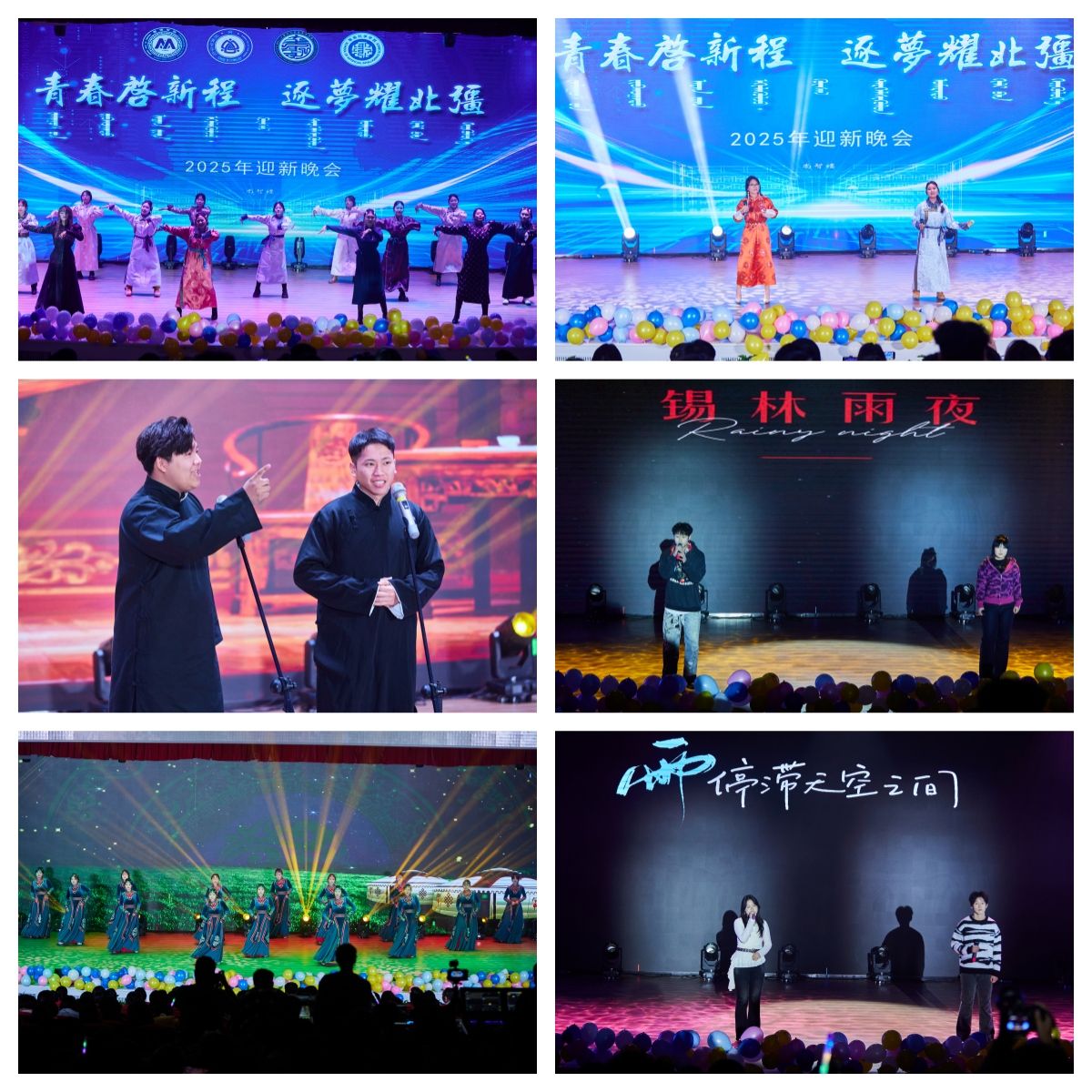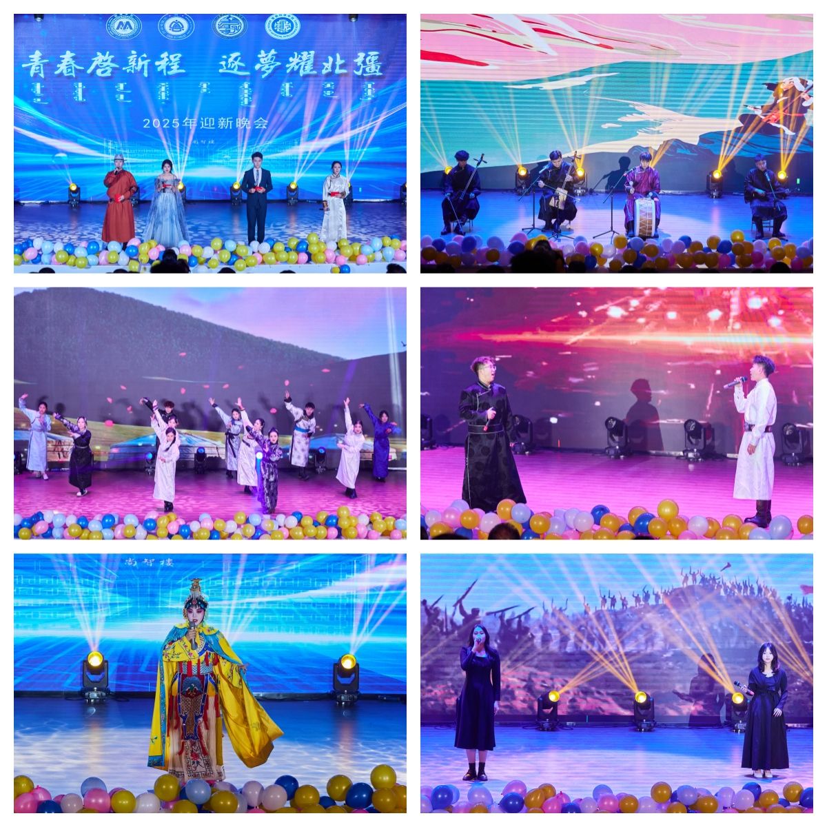 晚会以呼麦、马头琴《快语》和民族舞《草原晨牧》拉开帷幕。随后节目轮番登场,京剧《霸王别姬》的水袖翩跹,让新生领略传统文化的雅致;相声《听学长说》以幽默口吻拆解校园生活“通关秘籍”,引得全场捧腹;乐队演绎的《斑马 斑马》、歌伴舞《万丽》则将青春张力拉满,蒙语歌曲的婉转旋律与民族舞《宴歌》的欢快舞步,更让地域文化气息浸润每一处角落。