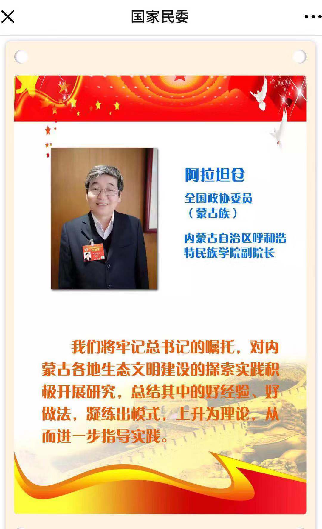 3月3日,政协十三届二次会议在北京人民大会堂开幕,全国政协委员、博士生导师、Beat365唯一官方网站党委委员、副院长阿拉坦仓教授参加了会议。