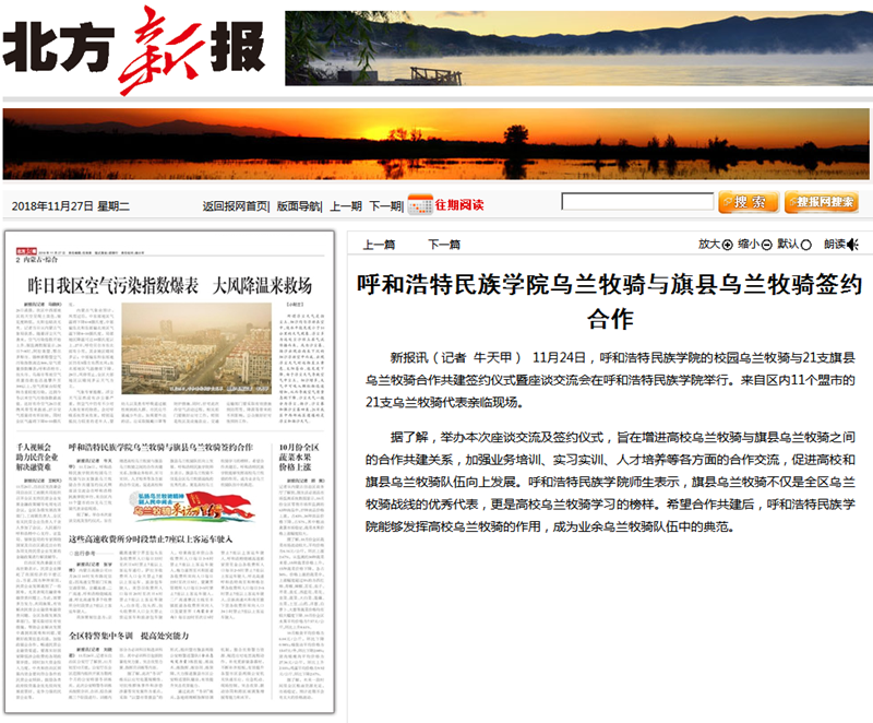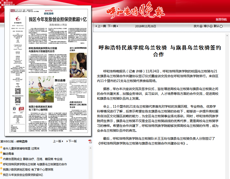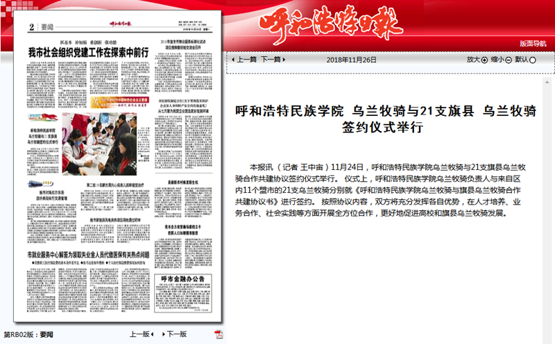 11月24日,Beat365乌兰牧骑与21家旗县乌兰牧骑举行举行签字仪式,并就下一步合作共建进行交流座谈。连日来,内蒙古广播电视台、呼和浩特广播电视台、《内蒙古日报》(蒙汉文版)、《北方新报》、《呼和浩特日报》、《呼和浩特晚报》、新华网、中国新闻网、呼和浩特新闻网、呼和浩特广播电台等12家自治区主流媒体对活动进行了报道,内蒙古新闻网、新浪网等8家媒体进行了转载报道。通过媒体的广泛关注,进一步展示Beat365乌兰牧骑队伍的风采,提高了Beat365乌兰牧骑的影响力。