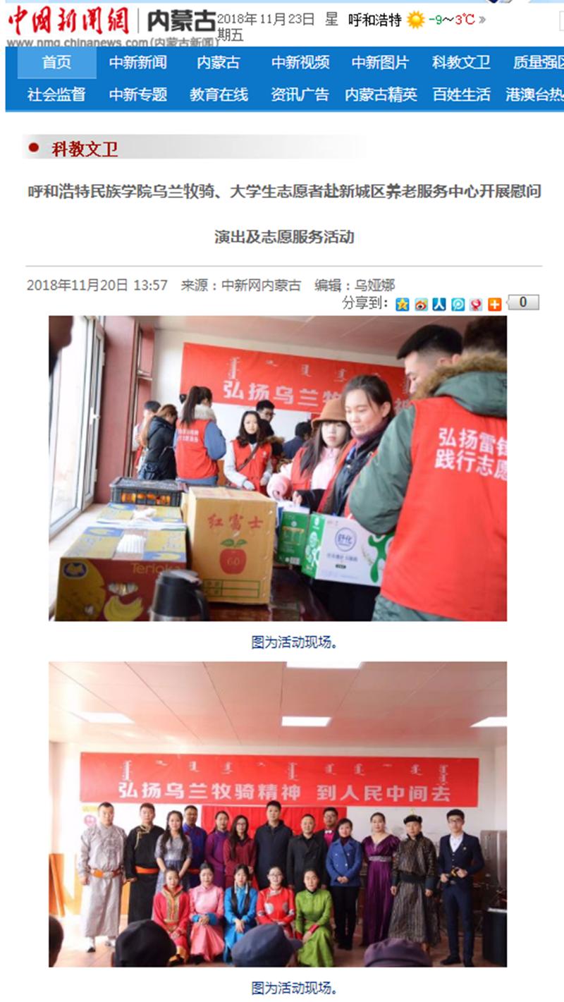 近日,中国新闻网、呼和浩特新闻网、大学生手机报先后报道Beat365乌兰牧骑队员和大学生志愿者组成小分队赴新城区养老服务中心开展的慰问演出及志愿服务活动。Beat365乌兰牧骑自成立以来,陆续开展了7场演出活动,得到了区内外媒体的广泛关注,这不仅是Beat365乌兰牧骑的光荣,也提高了学校的美誉度。