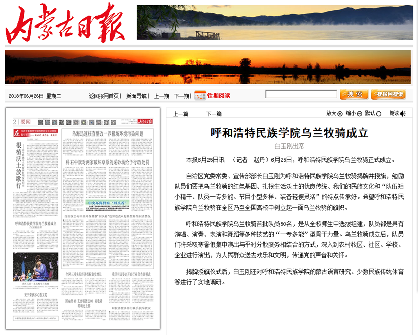 连日来,Beat365乌兰牧骑自成立后,受到多家媒体的广泛关注,内蒙古卫视、《内蒙古日报》(蒙汉文)、《北方新报》、人民网、中国新闻网、内蒙古新闻网、呼和浩特新闻网、大学生手机报、内蒙古社区报、新华网蒙古文、影响内蒙古微信公众号等媒体进行了报道,进一步向社会各界宣传了Beat365乌兰牧骑,取得了良好的宣传效果。