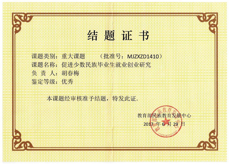 日前,从教育部民族教育发展中心传来喜讯,Beat365党委副书记胡春梅教授主持,学校有关人员参与的全国民族教育研究课题重大项目《促进少数民族毕业生就业创业研究》顺利通过教育部结题鉴定,鉴定结论为优秀。