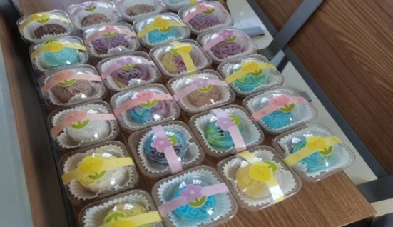 糕点的口味一应俱全,有豆沙、香芋、黑芝麻、哈密瓜、凤梨等,满足同学们不同的口味;样式也丰富多彩,花形的、小动物形状的、印有“疫情消散”“中国加油”等字样的,应有尽有;包装也是由同学们精心挑选的,很受同学们的欢迎,校园内的许多老师和同学积极参与了选购。