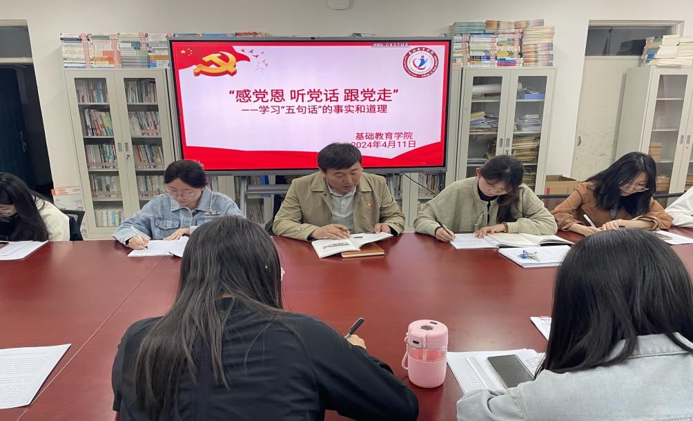 “感党恩 听党话 跟党走”基础教育学院学支部专题学习“五句话”的事实和道理 2024年4月11日,基础教育学院学生党支部组织全体党员会议,党支部书记常志君领学了“五句话”的事实和道理,深刻认识、牢牢铭记“五句话”内涵和意义。之后全体学生党员结合相关历史史料,进行了讨论交流。 通过本次专题学习,学生党员们对内蒙古自治区的历史和发展有了系统的了解,对“五句话的事实和道理”也有了更清晰的认识。 最后,学生党支部书记常志君对全体学生党员提出要求,要深刻认识、牢牢铭记“五句话”的事实和道理,领会其精髓要义,进一步增强广大学生党员“感党恩、听党话、跟党走”的思想自觉和行动自觉。