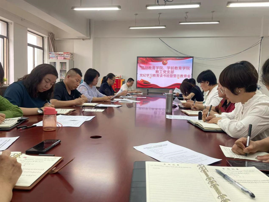 为深入学习贯彻新修订的《中国共产党纪律处分条例》(以下简称《条例》),引导学院全体教工党员树牢责任意识、底线意识和纪律意识,5月23日下午,基础教育学院教工党支部联合学前教育学院教工党支部在都林楼405会议室召开党纪学习教育读书班集中学习暨警示教育会。集中学习由基础教育学院党总支负责人萨日胡同志主持。