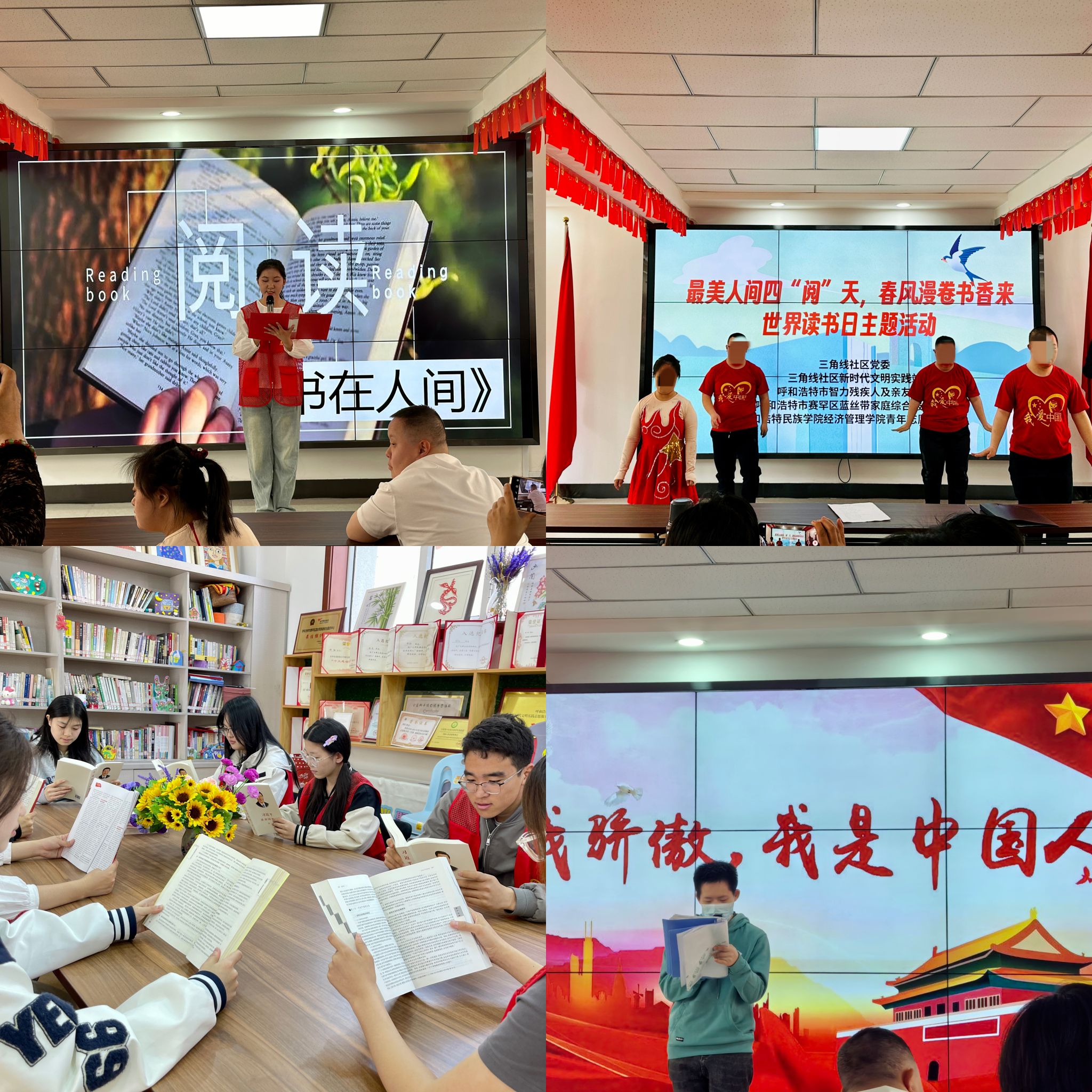 4月23日,是第29个“世界读书日”,为深入学习宣传习近平文化思想,坚持不懈用习近平新时代中国特色社会主义思想凝心铸魂,进一步推动全民阅读进社区工作深入开展,呼和浩特市新城区锡林北路街道三角线社区,经济管理学院学生党支部、团总支,蓝丝带公益,呼和浩特市智力残疾人及亲友协会联合开展最美人间四“阅”天,春风漫卷书香来——世界读书日主题志愿活动。