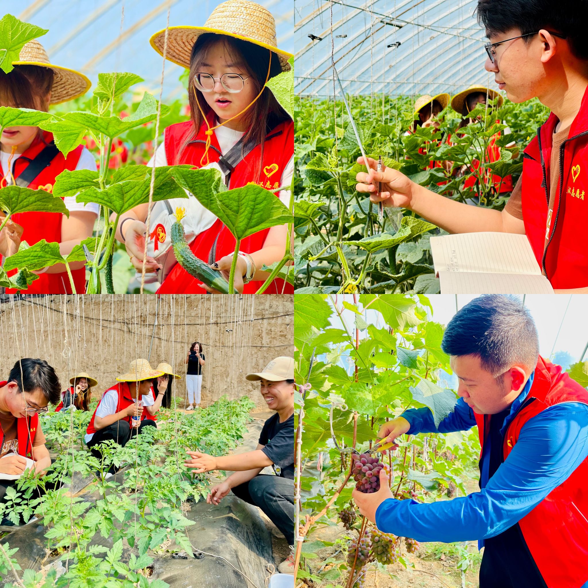 其次,青年志愿者们走进了新惠镇万亩设施农业扶贫产业区,学习大棚内葡萄、柿子等农作物栽培技术。帮助农户为农作物进行长势监测、杂草清理等工作。
