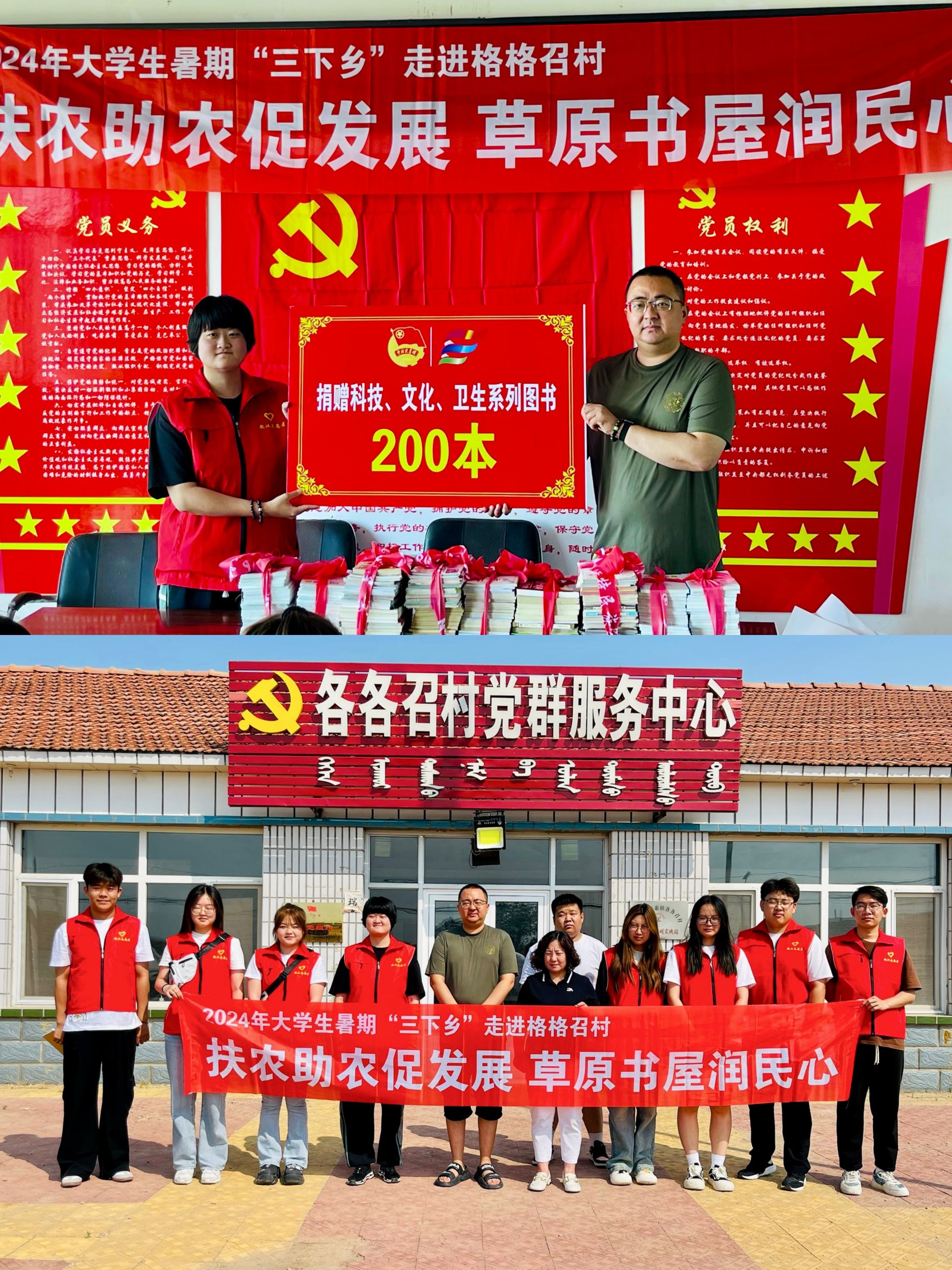 首先,学院青年志愿者们向格格召村委会捐赠200余册图书,此次捐赠图书仅丰富了格格召村草原书屋的图书资源,更为村民提供了一个交流学习、共享知识的平台